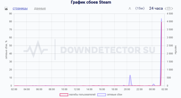 Скачок жалоб на сбои в Steam зафиксирован около 01:20 часов по мск. Пользователи жалуются на то, что Steam умер. Больше всего жалоб на сбои в играх Dota 2 и CS 2.